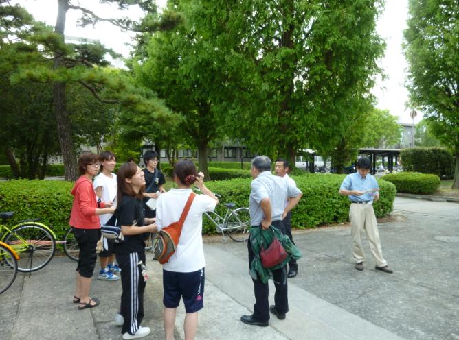 | 空手道部新聞をスポーツセンター前で配る光富先輩。左から 小田部さん(2)、田島さん(2)、篠原さん(1)、光冨先輩、星野くん(1)、野中君(1)、松本先輩、稲田先輩 |