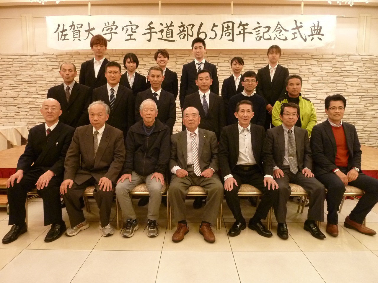 | 佐賀大学空手道部空手道部創部65周年記念式典開会の挨拶をされる長森OB会長。 創部以来の歴史の話の後、会長職を雪竹先輩に引き継ぐことの発表をされました。 |
