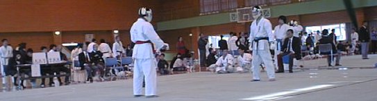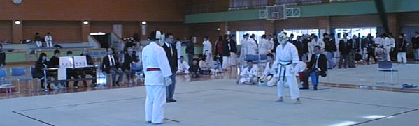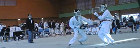 [右写真] 1回戦開始 右側:先鋒の岡本先輩 [下写真] 格闘中の岡本先輩 6−0で 岡本先輩が勝利を収めます |