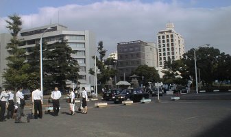 続々と福岡県庁横の 福岡市民体育館に宿泊ホテルから集まりました。