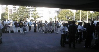 | 早朝から会場に集まった参加選手。 | 宿泊ホテルからタクシで集まる関西の運営スタッフ |