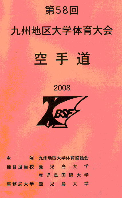 第58回九州地区大学体育大会 空手道 2008年7月13日 鹿児島県立体育館 主催 九州地区大学体育協議会 種目担当校 鹿児島大学、鹿児島国際大学 事務局大学 鹿児島大学 参加OB:稲田先輩[監督]、牛島先輩[監督]、井上雅善[運営記録] |
