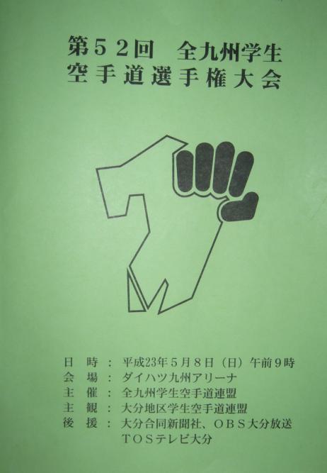 第52回全九州学生空手道選手権大会 日時:平成23年05月08日(日)9:00 会場:ダイハツ九州アリーナ 主催:全九州学生空手道連盟 主管:大分地区学生空手道連盟 後援:大分合同新聞社、OBS大分放送 、TOSテレビ大分