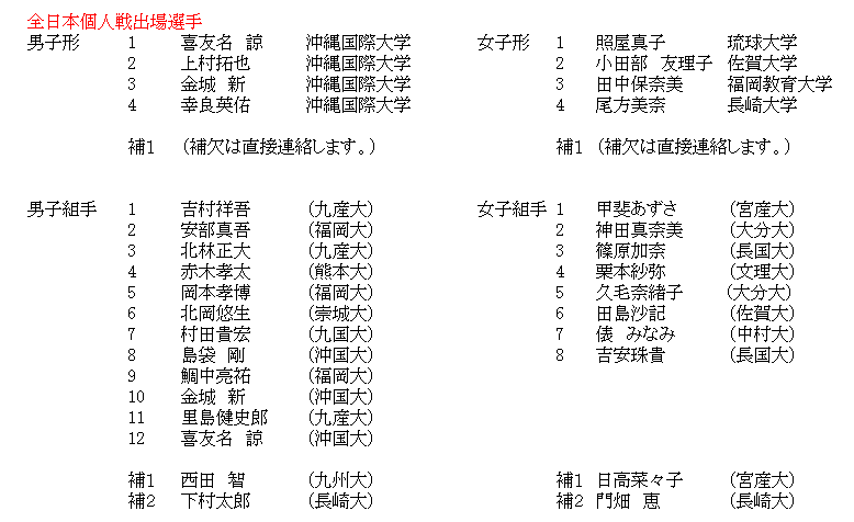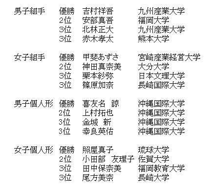 第52回全九州学生空手道選手権大会 日時:平成23年05月08日(日)9:00 会場:ダイハツ九州アリーナ 主催:全九州学生空手道連盟 主管:大分地区学生空手道連盟 後援:大分合同新聞社、OBS大分放送 、TOSテレビ大分