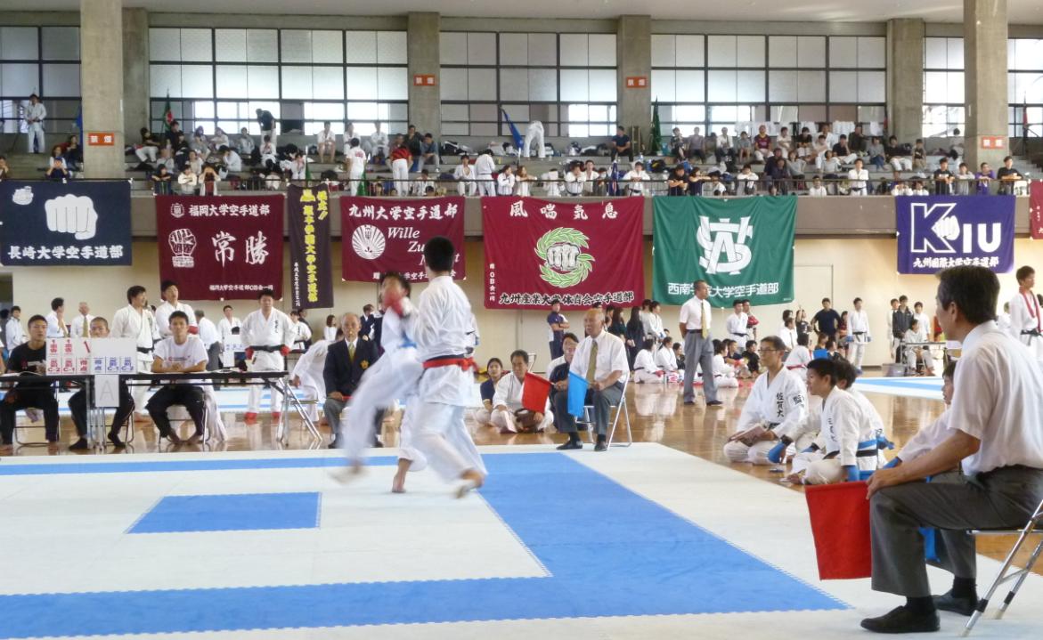 写真は 準決勝で九州産業大学(優勝校)と対戦する佐賀大(青帯)