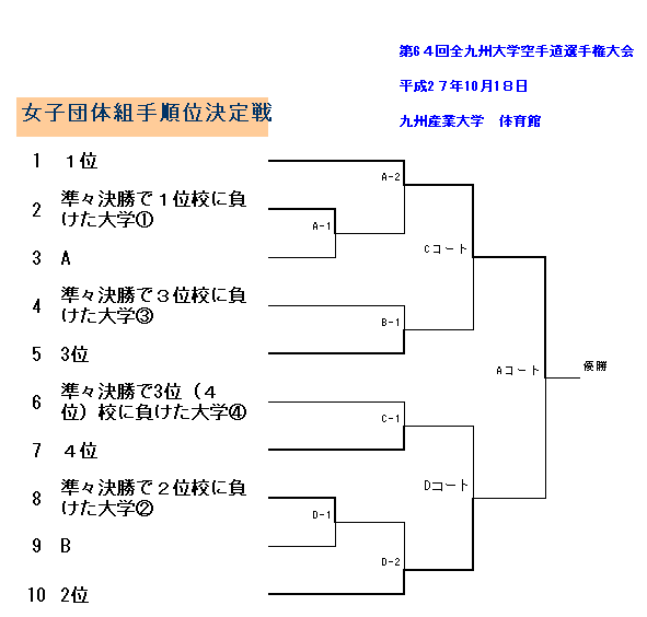開会式 佐大試合 表彰式 HOMEへ 大会パンフ表紙 総合結果 男子団体組手 男子組手順位決定戦 女子団体組手 女子組手順位決定戦 男子女子団体形 全国大会出場校