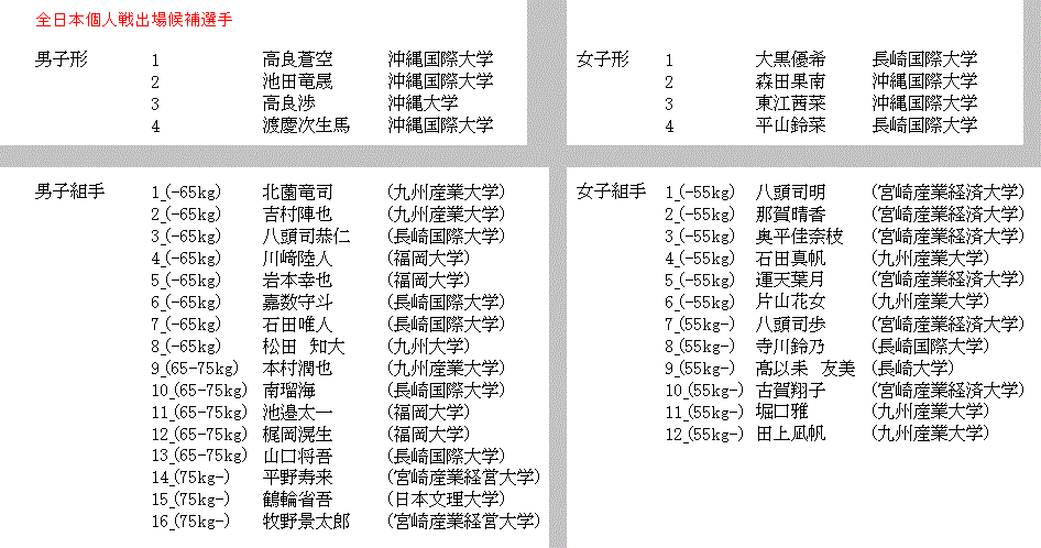 全九州個人戦開会式 全九州表紙 総合結果 男子組手-65kg 男子組手65-75kg 男子組手75-kg 女子組手-55kg 女子組手55-kg