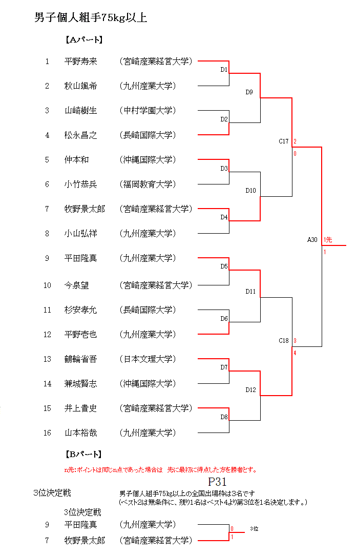 全九州個人戦開会式 全九州表紙 総合結果 男子組手-65kg 男子組手65-75kg 男子組手75-kg 女子組手-55kg 女子組手55-kg 男子形予選 女子形予選 男女形準決勝 男女形決勝/3位決定 佐賀大成績 HOMEへ