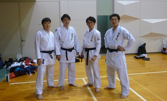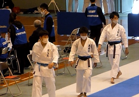 | 成年男子形第2プールに向かう佐賀大学木下君(2年) 準優勝した三神会び神代選手、谷口君(4年) 左から |