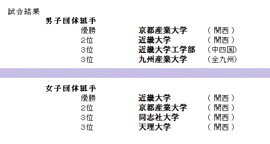 第58回西日本大学空手道選手権大会 総合結果 日時 令和3年6月27日(日)9時20分開会 場所 九州産業大学大楠アリーナ 主催 (一社)日本学生空手道連盟 後援 (公財)全日本空手道連盟 (公財)日本武道館 全日本空手道連盟 九州地区協議会 福岡県空手道連盟 福岡県 福岡市