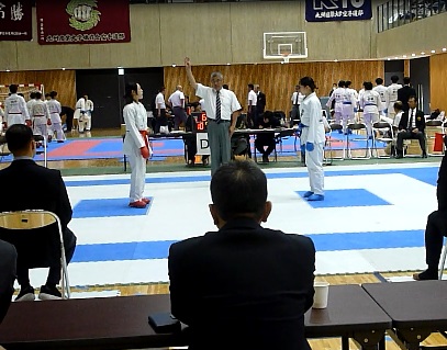 赤帯:相手の中堅は動きが良く突っ込んでの上段突きを取られる。 |
