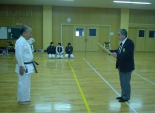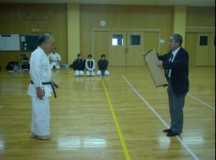 最初に長森佐大空手道部OB会長名にて長年、空手道部への功績があった光冨先輩への段位授受式が行われました。