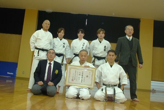 | 光冨先輩の卒部以来30年間の指導、部への貢献、審判員としての実績 全空連5段を鑑み 長森OB会長より 佐大空手道部段位6段が送られました。 |