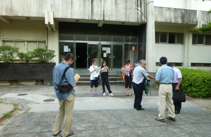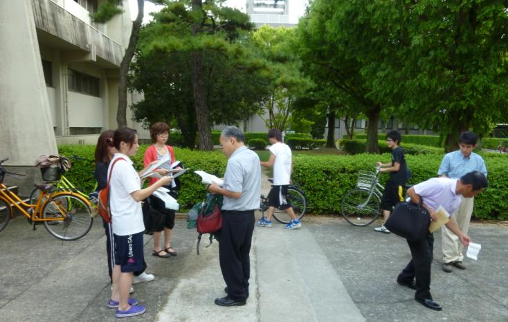 | 空手道部新聞をスポーツセンター前で配る光富先輩。左から 小田部さん(2)、田島さん(2)、篠原さん(1)、光冨先輩、星野くん(1)、野中君(1)、松本先輩、稲田先輩 |