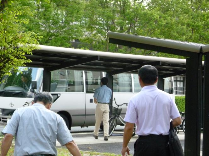 | 全員揃ったところに鯉しげのバスが迎えに来ていただきました。 | 鯉しげの送迎バスに乗り込むOBの先輩方。長森OB会長は直接、鯉しげにむかわれてました。 |