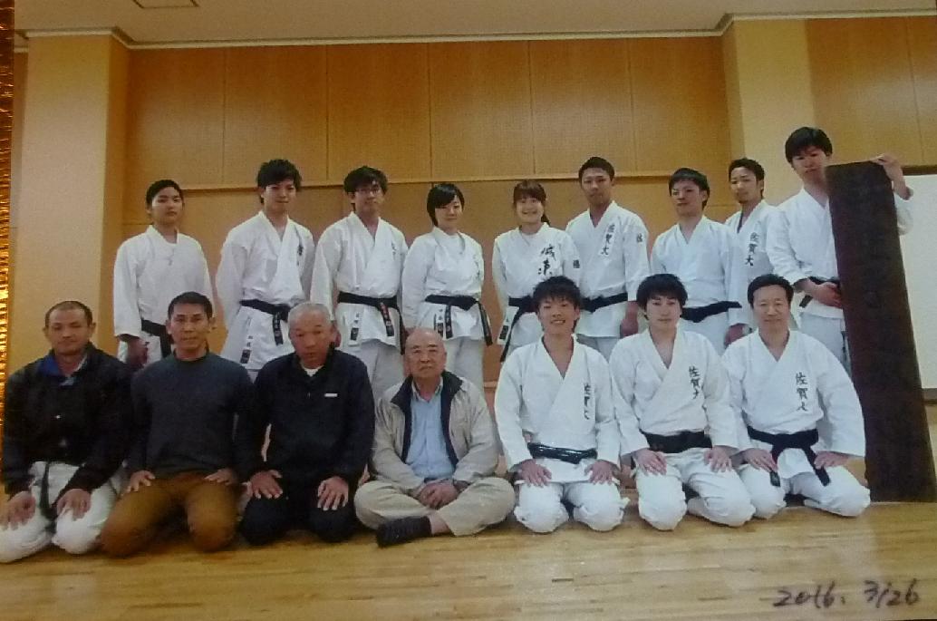 2016年3月26日(土曜日) 追い出し組手 場所:佐賀大学スポーツセンター 空手道部道場 4年生の星野君、野中君 の卒部イベントである追い出し組手が行われました。 星野君、野中君 4年間お疲れ様でした 写真前列左から 牛嶋監督、岡本先輩、光富先輩、長森OB会会長、星野くん(4年)、野中君(4年)、空手道部顧問金子教授 写真提供 長森OB会会長