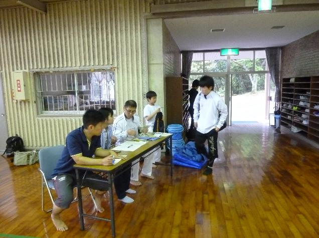 | 形指導をする岡本先輩と 、光富先輩 | 佐賀県黒髪少年自然の家スタッフによる 入所式(施設の説明) |