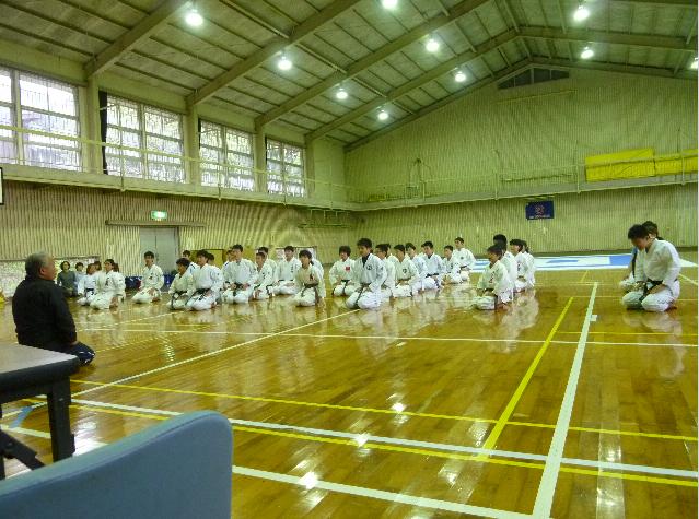 | 受付は佐大空手道部員 | 第1日目の合同練習の開所挨拶をされる主催者の光富先輩 | ||