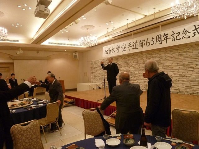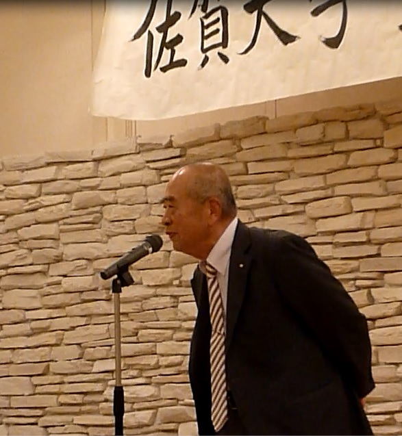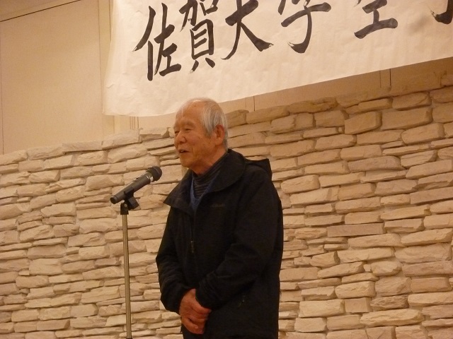 | 佐賀大学空手道部空手道部創部65周年記念式典開会の挨拶をされる長森OB会長。 創部以来の歴史の話の後、会長職を雪竹先輩に引き継ぐことの発表をされました。 |