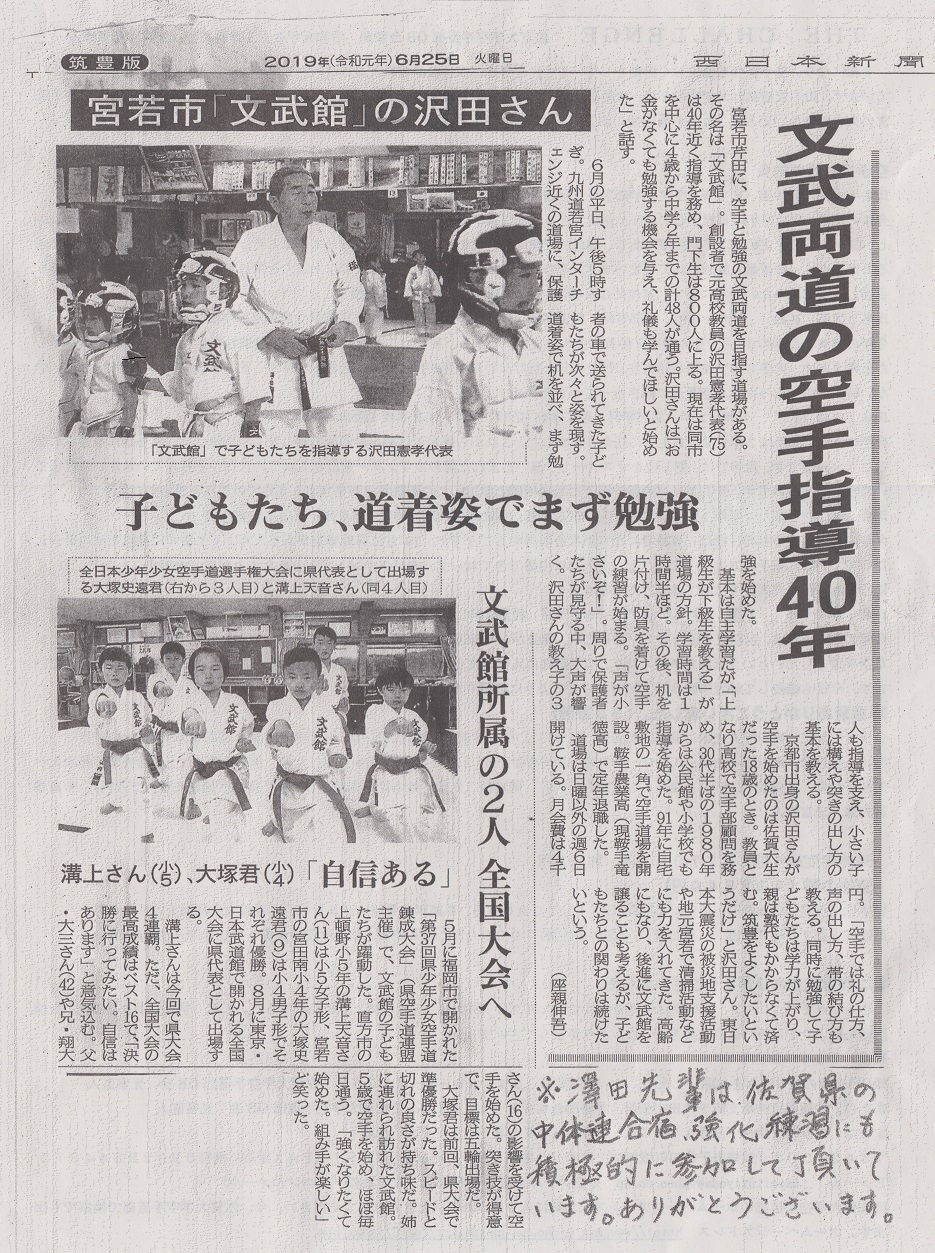 澤田先輩の文武館道場が2019/.6/25西日本新聞 筑豊版に掲載されました。 近年、優秀な経験者が入部してくれるのも澤田先輩の佐賀県中高校空手道合同合宿のへの 参加に寄るものが大いなるものがあります。 澤田先輩の益々のご活躍をお祈り申し上げます。 HOMEへ