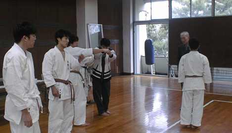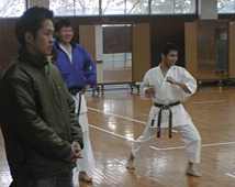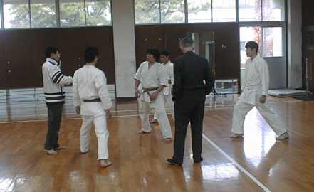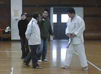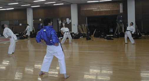 | 剣道場を借りての練習開始 | 賀数君の後ろで練習しているのは少林寺です。 |