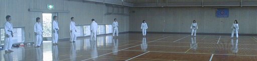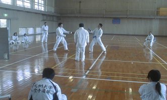 | 合宿会場の体育館 | 練習の成果を検証する組み手 |