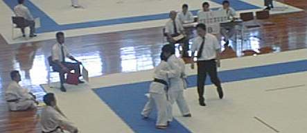 | 副将:大野(1年) 二段 近接戦を戦う(左) インターハイで型 全国8位を 取った大野も 本大会でベスト4迄行った 熊本学園大の副将には苦戦。 |