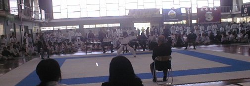 | 女子優勝の常連 九産大選手と戦う 、藤井さん(1年) 右側,残念ながら6−1で破れました。 |