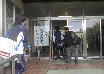| 宮崎大学体育館に入っていく佐大チーム | 既に他の大学の学生が練習していました。 |