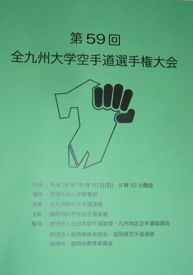 第59回全九州空手道選手権大会 日時:平成10年10月10日(日) 場所:西南学院大学体育館 主催:全九州学生空手道連盟 主管:福岡地区大学空手道部 後援:財団法人 全日本空手道連盟・九州地区空手道協会 財団法人 福岡県体育協会・福岡県空手道連盟 福岡市・福岡市教育委員会