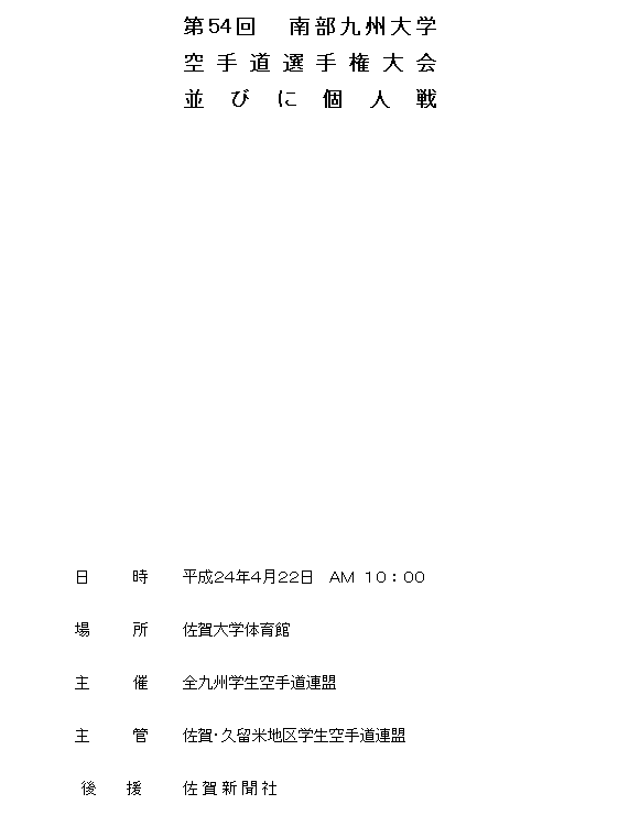 日時 平成24年4月22日 AM 10 : 00 場所 佐賀大学体育館 主催 全九州学生空手道連盟 主管 佐賀・久留米地区学生空手道連盟 後援 佐 賀 新 聞 社