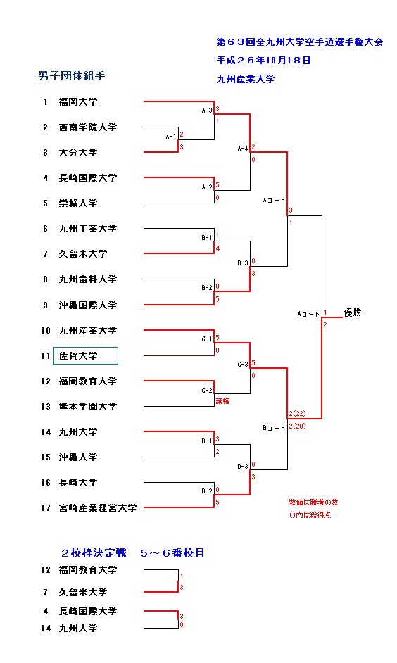 第63回全九州大学空手道選手権大会 平成26年10月19日 九州産業大学 体育館 男子団体組手 全国大会出場枠が男子は6校であるため BEST4に加え 5,6番の2校の決定戦を実施した。