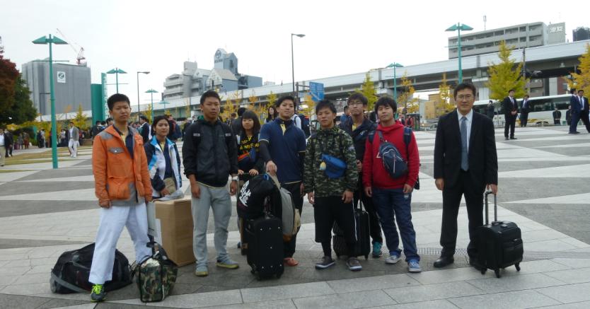 | 大阪中央体育館前で空手道部員と 鈴木監督(右端) |
