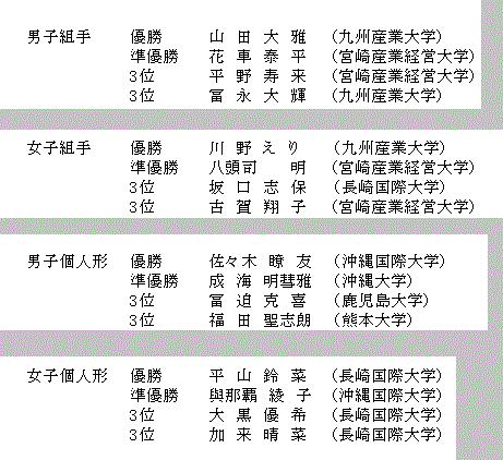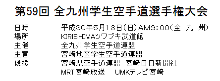 第59回 全九州学生空手道選手権大会 日時 平成30年5月13日(日)AM9:00 場所 KIRISHIMAツワブキ武道館 主催 全九州学生空手道連盟 主管 宮崎地区学生空手道連盟 後援 宮崎県空手道連盟 宮崎日日新聞社 MRT宮崎放送 UMKテレビ宮崎 総合結果