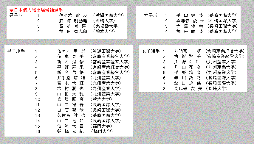 開催式 表紙 個人戦総合結果 男子個人形 女子個人形 女子個人組手 男子個人組手 佐賀大結果 Excel PDF HOME