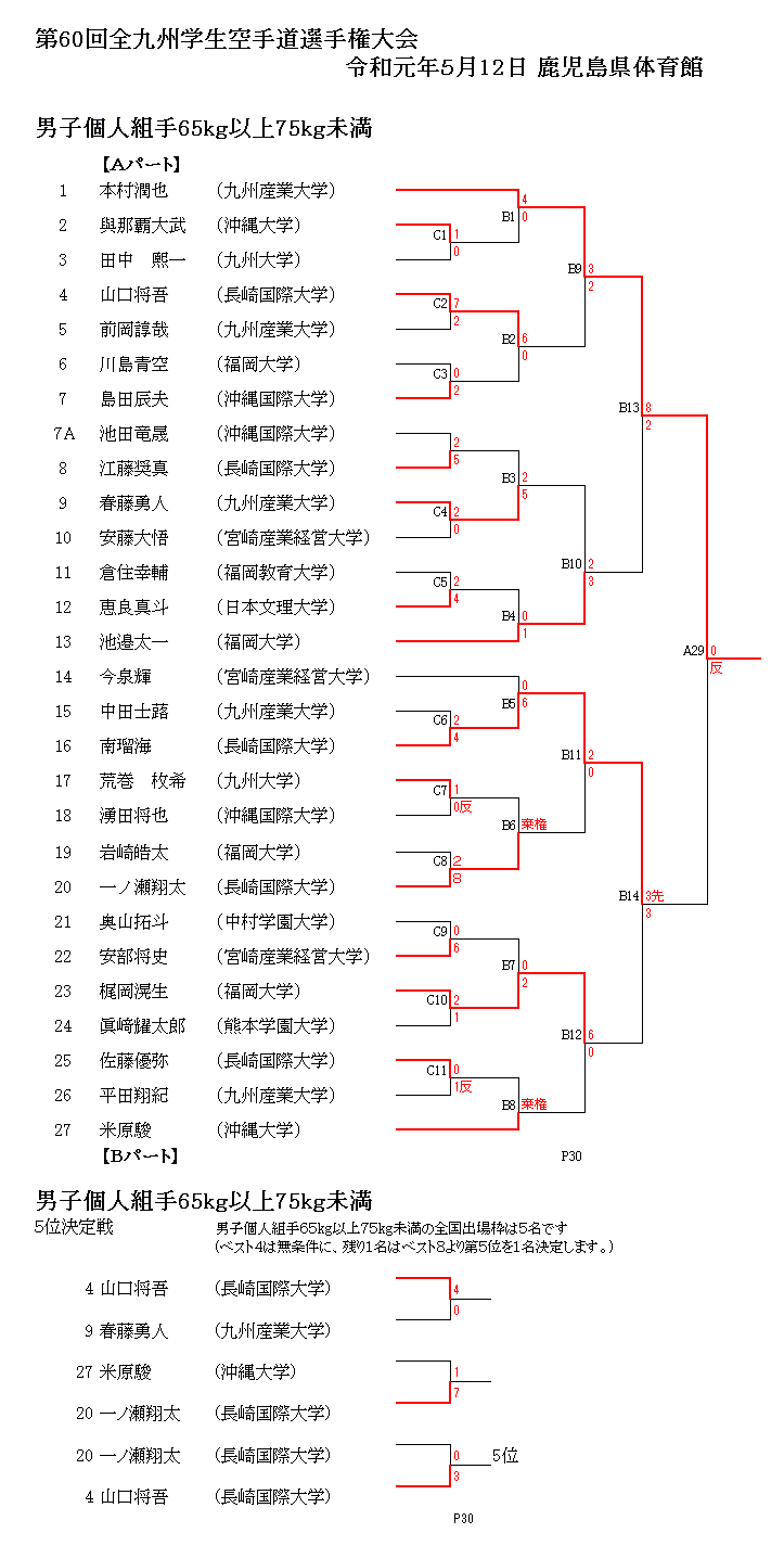 全九州個人戦開会式 全九州表紙 総合結果 男子組手-65kg 男子組手65-75kg 男子組手75-kg 女子組手-55kg 女子組手55-kg 男子形予選 女子形予選 男女形準決勝 男女形決勝/3位決定 佐賀大成績 HOMEへ
