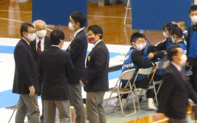 | 大会副院長を務められた岡本先輩(左から4番目) | 主審の福光先輩 |