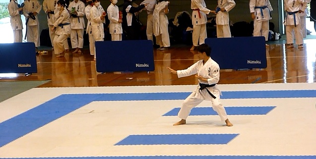 第2プールで最高スコアを出した三神会の神代選手 長崎国際大は九州で一番形競技に強い大学です。 |