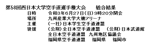 第58回西日本大学空手道選手権大会 総合結果 日時 令和3年6月27日(日)9時20分開会 場所 九州産業大学大楠アリーナ 主催 (一社)日本学生空手道連盟 後援 (公財)全日本空手道連盟 (公財)日本武道館 全日本空手道連盟 九州地区協議会 福岡県空手道連盟 福岡県 福岡市