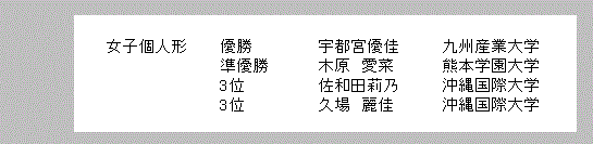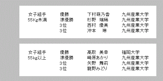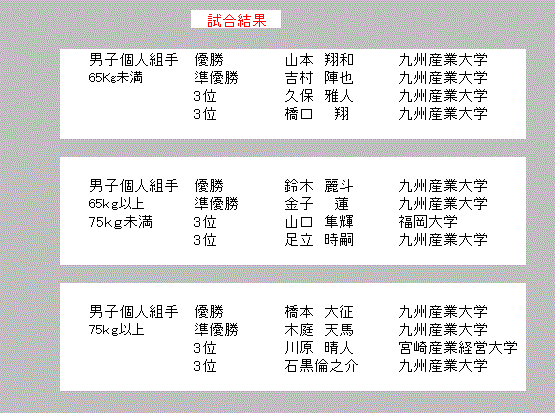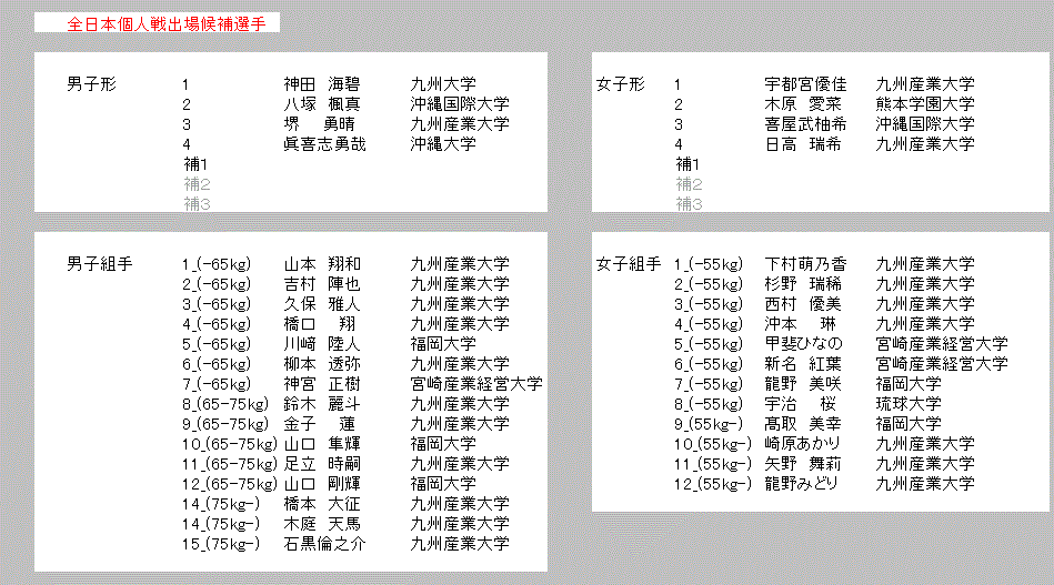 A.会場 B.佐賀大成績 1.表紙 2.総合結果 3.男子組手65kg未満 4.男子組手65~75kg 5.男子組手75㎏以上 6.女子組手55㎏未満 7.女子組手55kg以上 8.男子形予選 9.女子形予選 10.男子_女子形準決勝 11.男子_女子3位決定_決勝戦 戻る