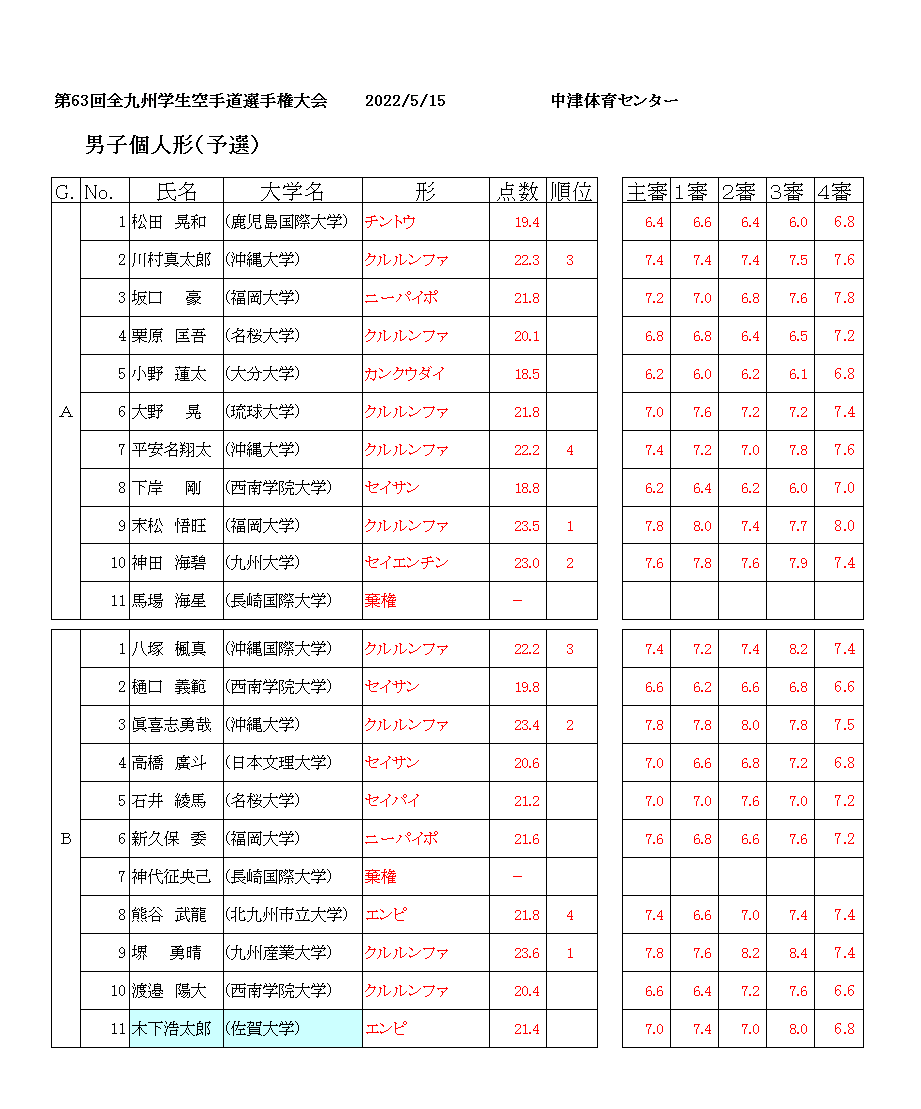 第63回全九州学生空手道選手権大会 2022/5/15 中津体育センター 男子個人形(予選)