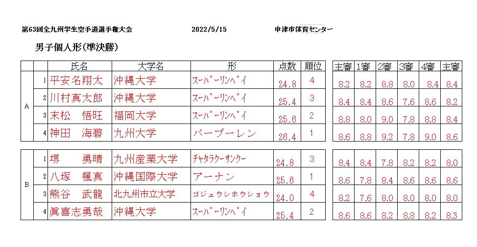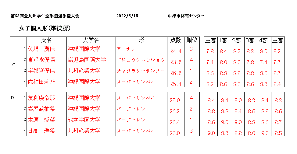 第63回全九州学生空手道選手権大会 2022/5/15 中津体育センター 男子個人形(準決勝) 女子個人形(準決勝)