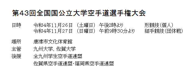 第43回全国国公立大学空手道選手権大会 2022/11/26 土曜日 ~ 11./27 日曜日 唐津市文化体育館