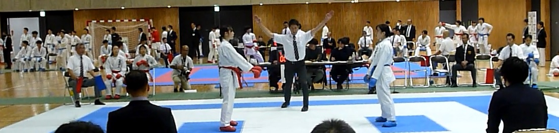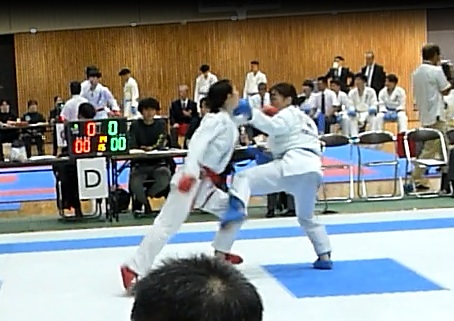 | 青帯:柳さんの蹴りの間隙を突いて 赤帯:敵先鋒の上段突きが入りました。 最後までこの1ポイントを返せずに0-1で破れます。 |